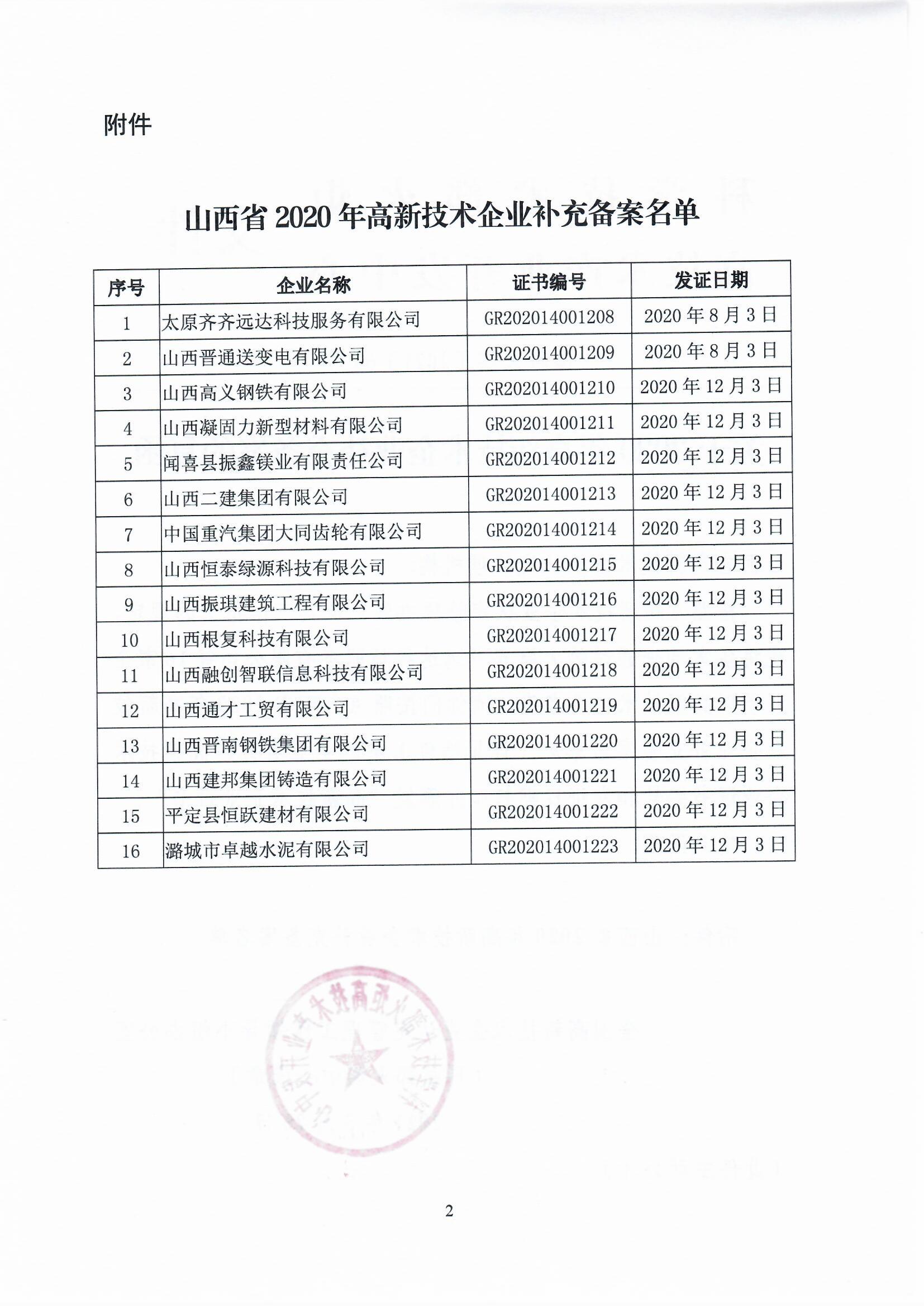 山西關(guān)于2020年高新技術(shù)企業(yè)補充備案的復(fù)函